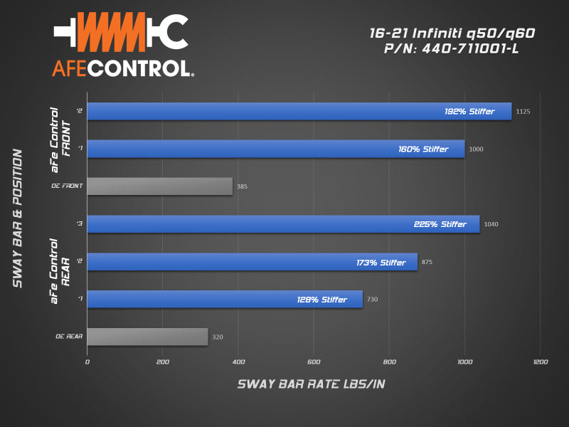Transform your Infiniti into a canyon carving machine with aFe CONTROL sway bars. With 3-way adjustability in the rear, you can easily dial in the handling balance and eliminate understeer. Body roll will be reduced, maximizing tire contact with the road. Sharpened steering response will improve initial turn-in making the car more agile and feel lighter. Whether its stability on the track, more rotation on the autocross, or just adding confidence in the canyon, aFe CONTROL sway bars will deliver. Every aFe CONTROL sway bar is CAD designed and CNC bent to strict tolerances. This insures precise fit and perfect operation. Our rear sway bar has 3-way adjustment. This allows the driver to dial in the rear roll resistance to achieve the desired handling bias. The rear sway bars utilize CNC machined ends. These are TIG welded to the bar in a dedicated fixture to insure accurate hole positioning and consistent manufacturing. aFe Control includes low-deflection polyurethane bushings and premium 6061-T6 aluminum black anodized billet brackets. Brackets are equipped with grease fittings for easy maintenance.
